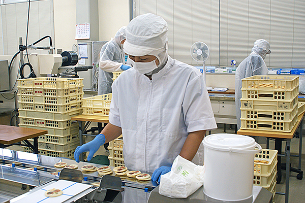 職人さんが焼いた様々な形や味のおかきを一列に並んで缶に詰めたり、ちいさなあられを1つひとつ組み合わせて小袋にアソートしたり、食品にプリントする機械でおせんべいにイラストを描いたりもします。